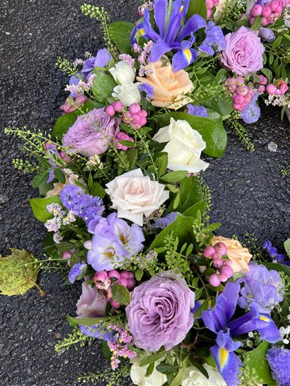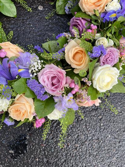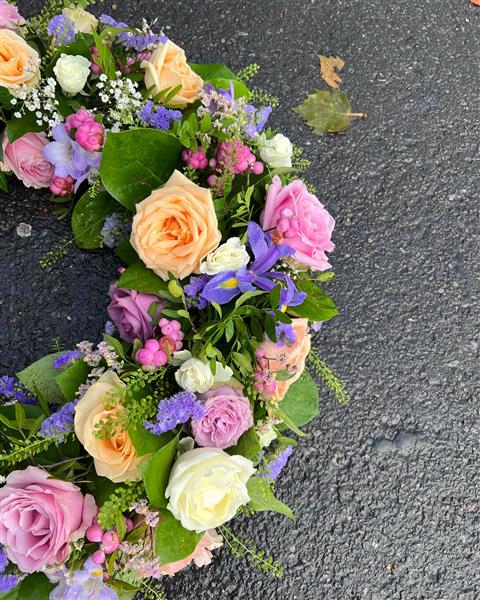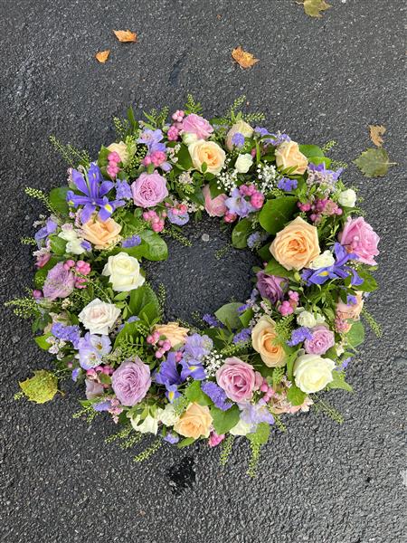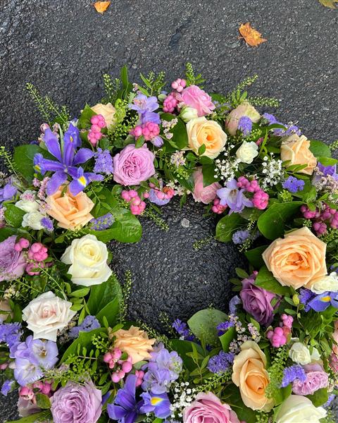 A beautiful wreath made with stunning roses. Peach, Pink and Cream Avalanche Roses. Lilac Cool water roses with Lilac Statice, Iris, Freesia and Pink Snow Berries.