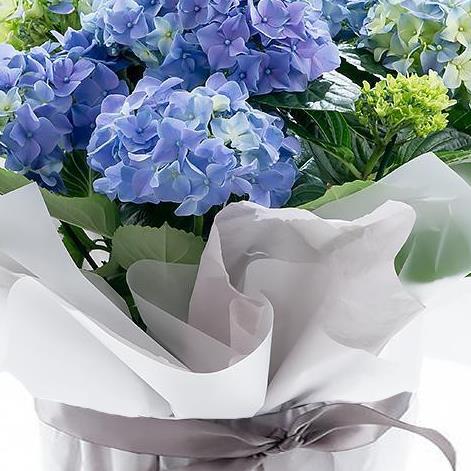 This stunning blue hydrangea arrives gift wrapped with ribbons. It can be kept inside during flowering and if planted outside and regularly watered it will come back each year.