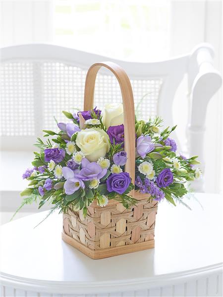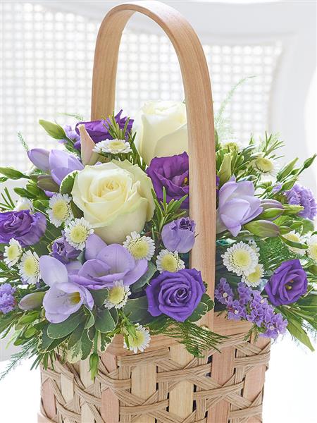 Featuring lilac statice, blue lisianthus, ivory large headed roses, lilac freesia and white spray chrysanthemum with asparagus fern, pittosporum and rosemary, presented in a natural softwood basket.