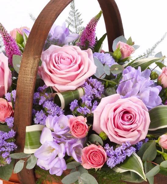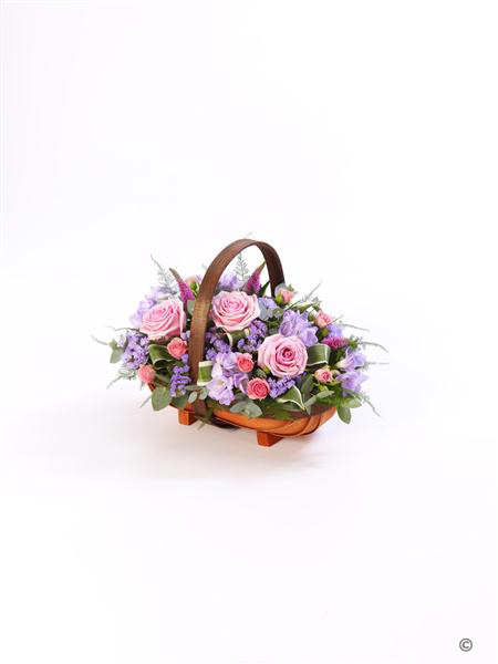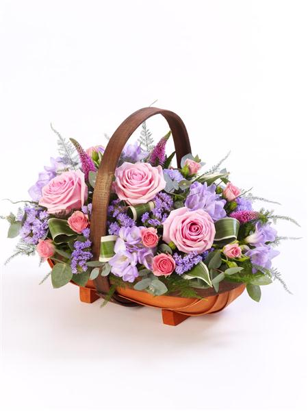A traditional trug basket filled with roses, veronica, statice and scented freesias in pinks and lilacs.