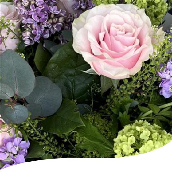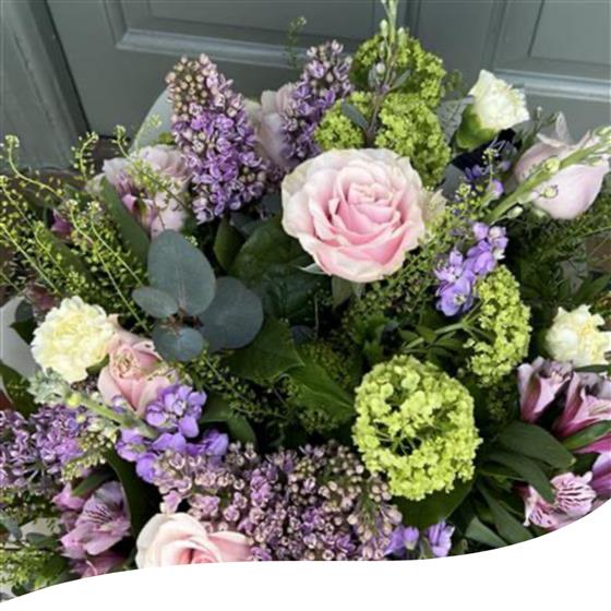 Celebrate any occasion with our Lilac Pink & Pale Green Bouquet, a stunning hand-tied arrangement featuring Lilac Syringa and Pale Pink Avalanche Roses. This elegant bouquet is designed to captivate and charm, making it a perfect choice for celebrating new beginnings or marking special moments.