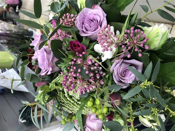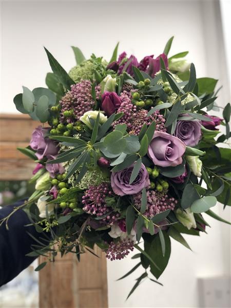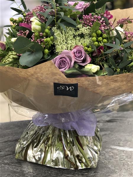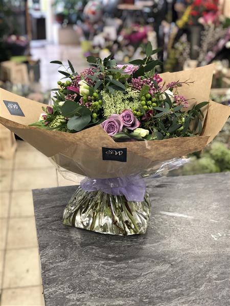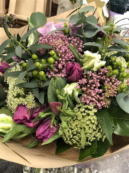 This Lilac spring special hand tied has mixed Purple and White Parrot Tulips, Lilac Roses, Mixed Eucalyptus, Ammi Visnaga, Green Hypercium Berries and Lilac Asclepia.