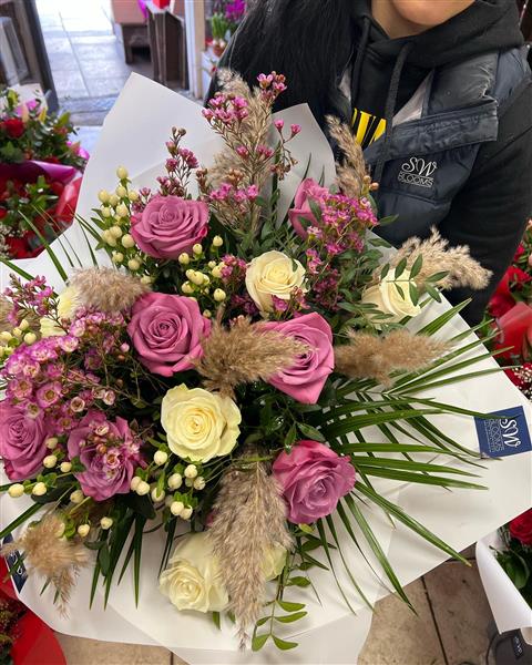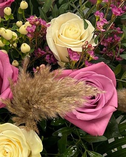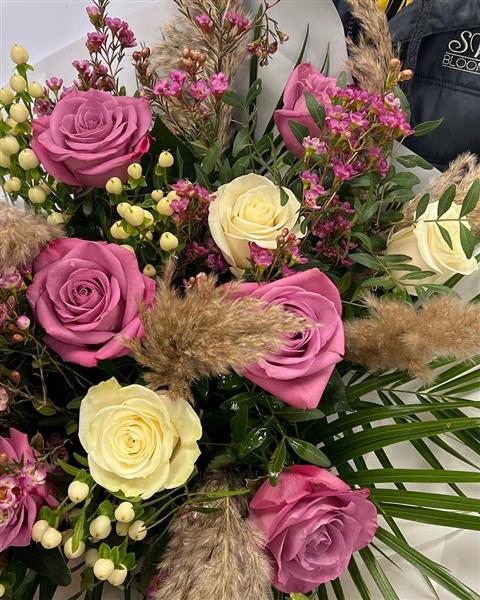 A luxury hand tied made with large white and lilac roses, Pampas’s grass, Wax Flowers and clusters of lovely white Hypericum berries.