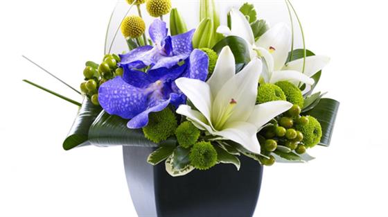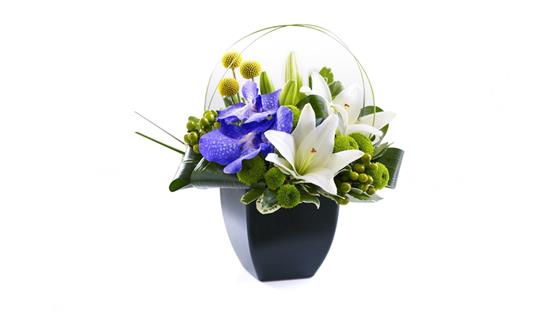 This is a very special arrangement that displays these exquisite blue Vanda orchids and pristine white LA lilies beautifully. In this design we’ve created a wonderfully sculpted display that simply exudes contemporary chic.