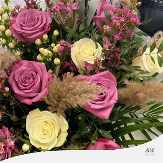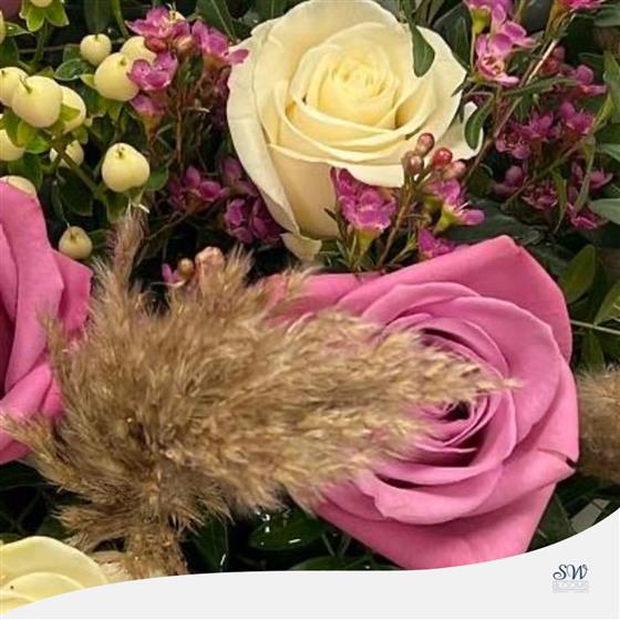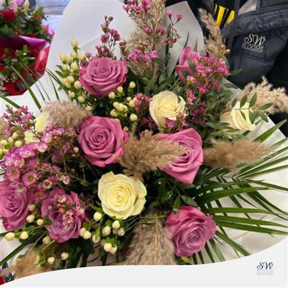 Our Luxurious Creamy Hand-Tied Bouquet is a true masterpiece crafted with care and artistry. This arrangement features large, pristine white and enchanting Lilac Roses, elegantly intertwined with the ethereal beauty of Pampas Grass. The delicate Wax Flowers add a touch of sophistication, while clusters of lovely white Hypericum Berries enhance the bouquet's charm.