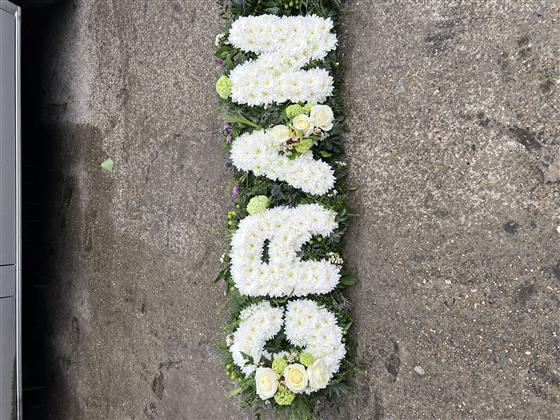 A luxury Grandad Tribute made with a lovely foliage backing around each letter. Chrysanthemum base on each letter with Dorchester Rose sprays. Green Viburnum, Spray Roses and Lisianthus complete this amazing tribute.