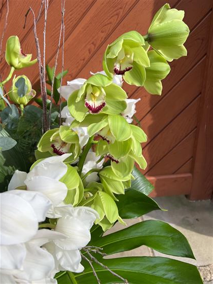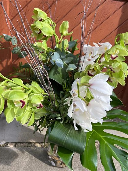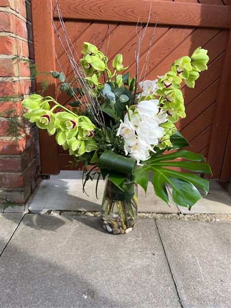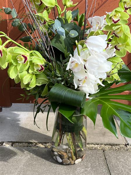A large vase of Green and White Cymbidium Orchids woth choice foliage and some stones in stage vase.