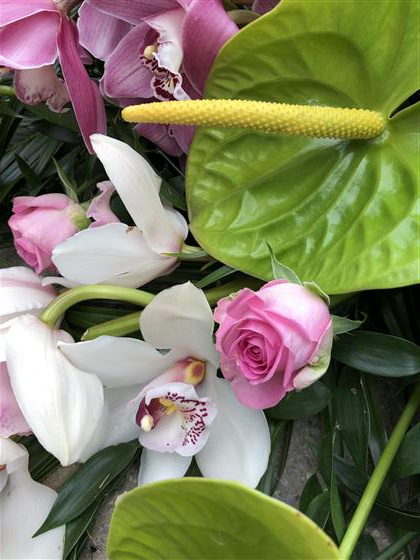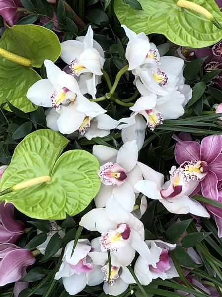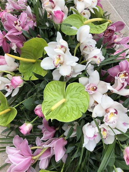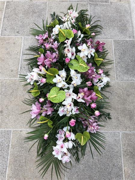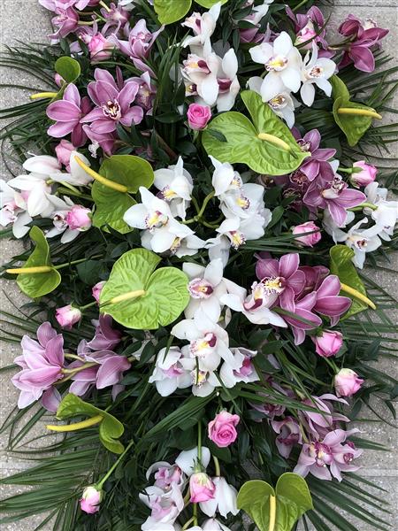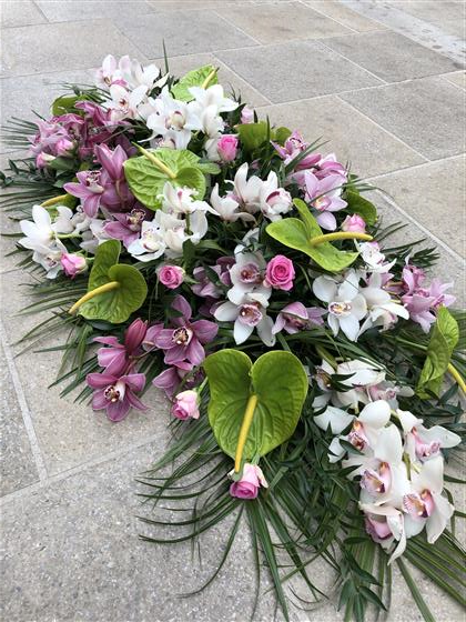 Stunning Coffin Spray using up mainly Cymbidium Orchids in Pink/Purple and White. Green Anthiriums and Pink Roses.