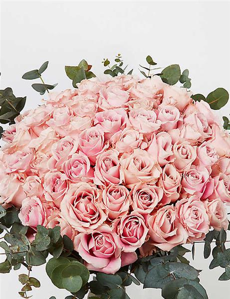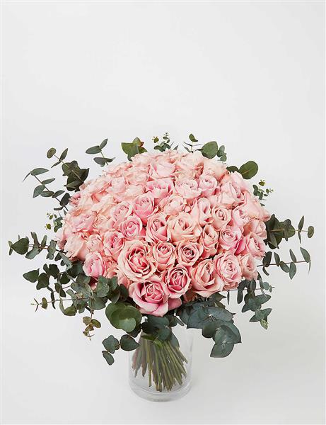 As pictured - Stunning, Luxury hand tied bouquet of beautiful long stemmed Mondial Pink roses with our tall Eucalyptus.