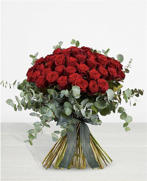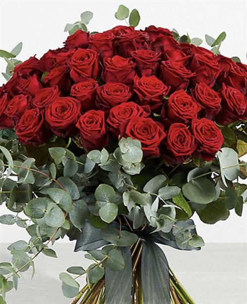 40 Naomi or Freedom Grade A Roses 70cm tied with long stemmed Eucalytpus - Luxury hand tied bouquet of 40 beautiful, long stemmed roses with our tall Eucalyptus.