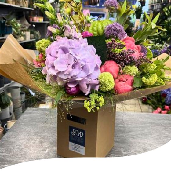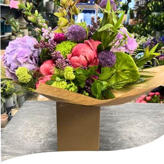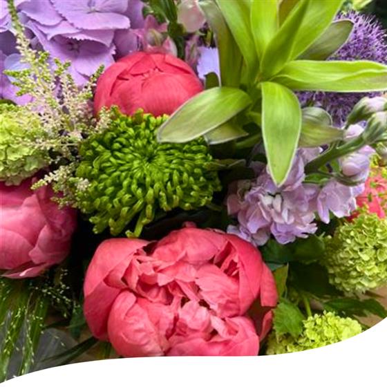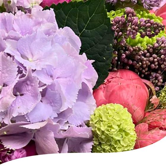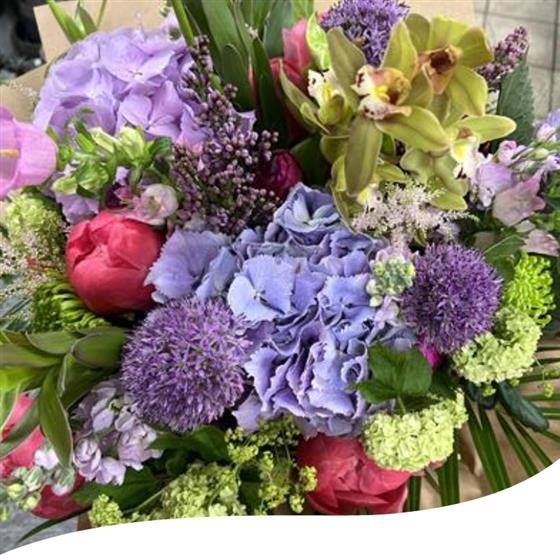 The Luxury Summer Bouquet is a stunning arrangement featuring a rich mix of Peonies, Hydrangeas, Anthuriums, Lilac Syringa, Green Shamrocks, Pink Astilbe, Campanula, Alliums, Orchids, Viburnum, Panicum Fountain Grass, Alchemilla Mollis, and Palm Leaves. At our florist, every flower is carefully selected and expertly arranged to create a beautiful combination of colours and textures, celebrating the vibrant beauty of summer with charm.