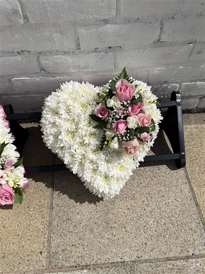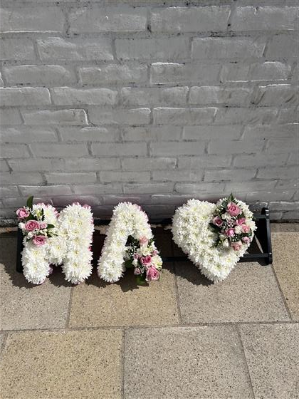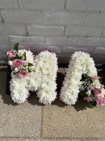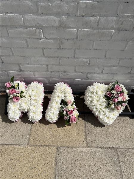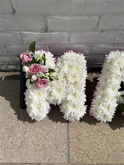 A MA tribute with a heart on the end. We made this one using pink roses and pink ribbons. We can Customise this however you want. Please get in touch and we can assist you.