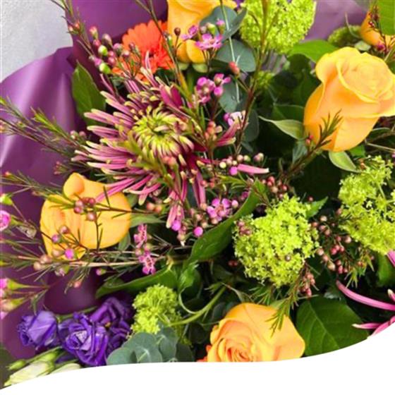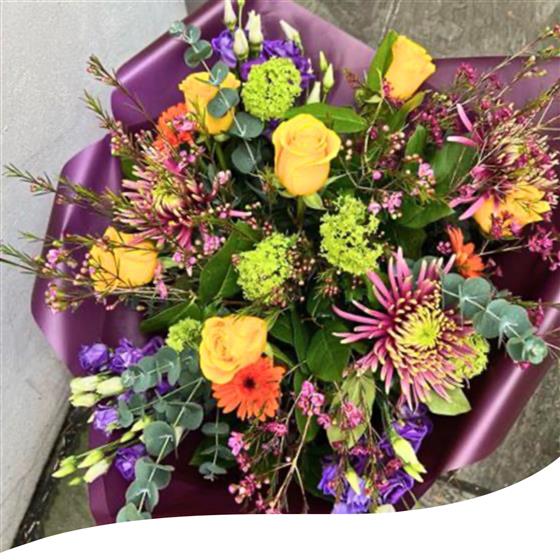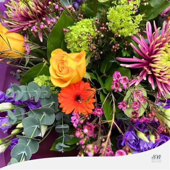 Meet the Majestic Oasis Bouquet: Featuring a stunning combination of Roses, Anastasia Blooms, Gerberas, Viburnum, Purple Lisianthus, Pink Wax, Eucalyptus and mixed foliage, this bouquet is a breathtaking work of art. The vibrant colours and textures come together to create a truly captivating arrangement, perfect for any occasion. Whether you're celebrating a special event or simply want to brighten someone's day, this bouquet is an excellent choice. It arrives hand-tied, gift-wrapped, and in water, ready to impress.