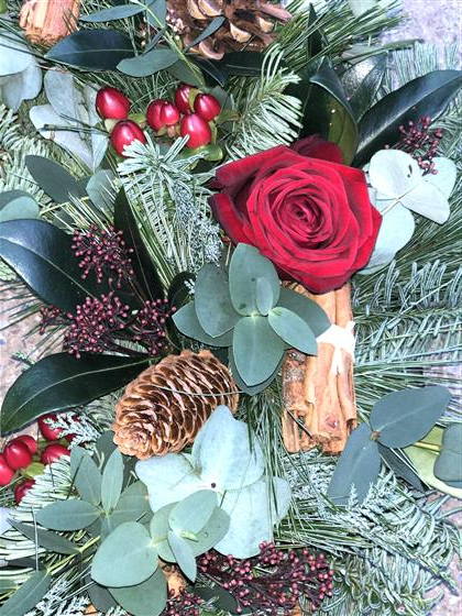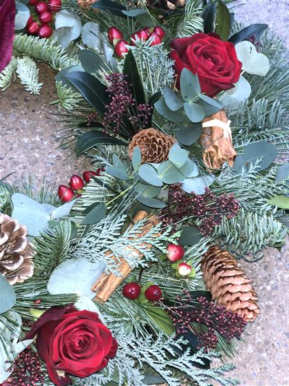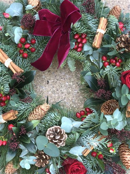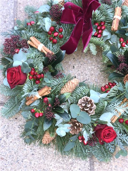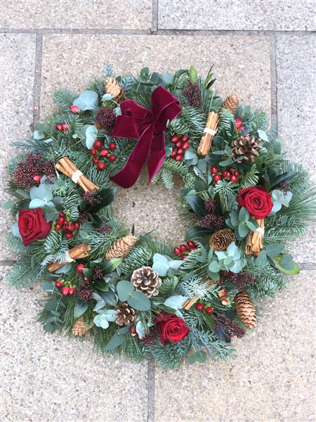 A special long lasting Mixed Pine wreath with A lovely bow, mixed Pine cones, Cinnamon Sticks and Red Skimmia. Red Naomi Roses and Hypericum Berries.
