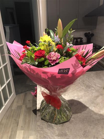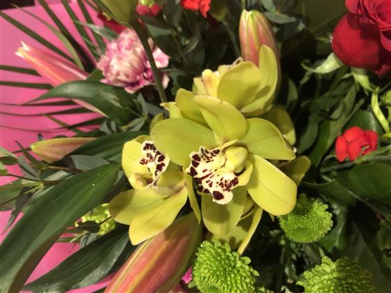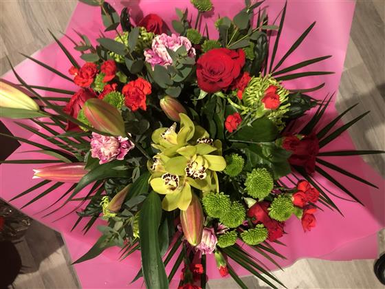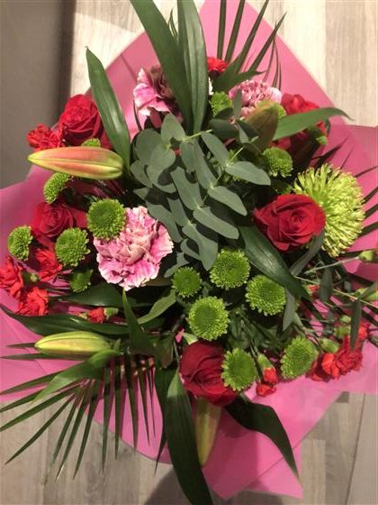 A Special Long lasting Recipe of Valentines Flowers. Including Red Roses, Pink Oriental Lily, Spray Carnations, Shamrock blooms, Cymbidium Orchids and Alstroemerias with fresh Eucalyptus and other Choice Foliage.