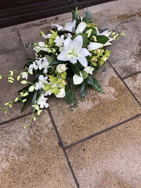 A lovely basket of mixed Dendrobium and Cymbidium Orchids, Roses and Lily.