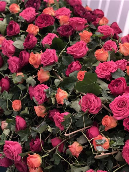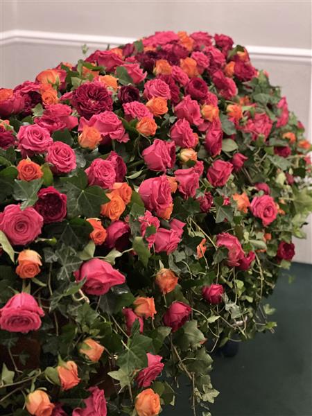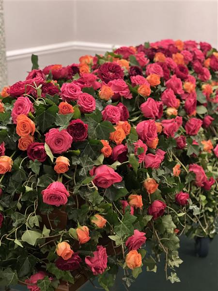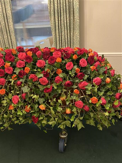 Ivy trailing down the whole coffin, basically concealing the whole thing. Roses are sealed and then individually wired in all the way around.