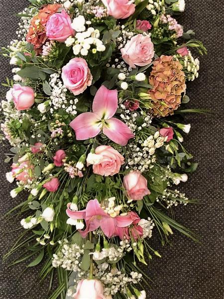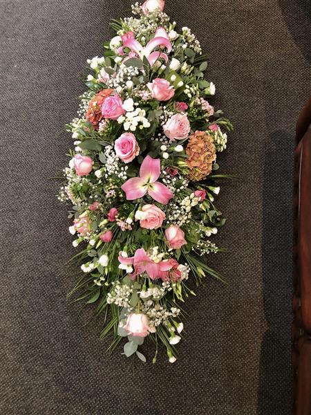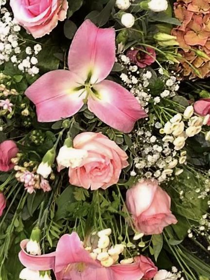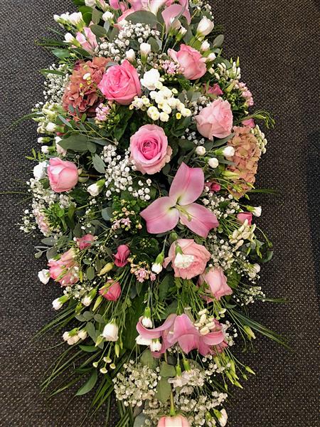 A beautiful blend of pink pastel flowers. Using a nice mixture of Roses, Hydrangeas, Carnations, Chrysanthemums, Gypsophila & Lilies. We use a nice blend of greens and foliage.