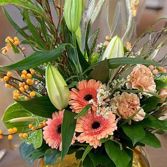 A modern Green and Peach vase using Anthuriums, Shamrock blooms, Grevillia foliage, Cookies and Cream Gerberas, honey Terracota Carnations, Tall Orange Ilex Berry, large oriental Lily and White limonium.