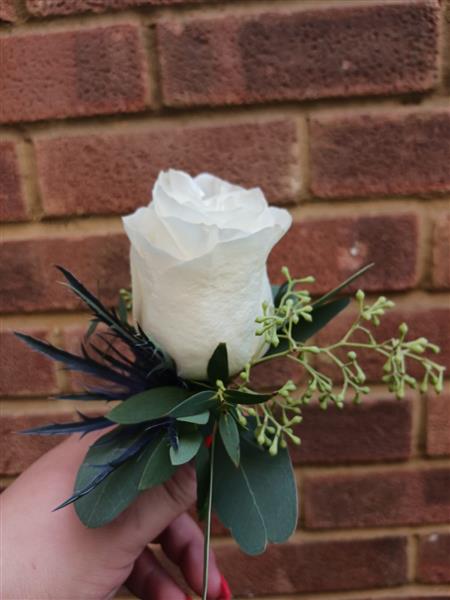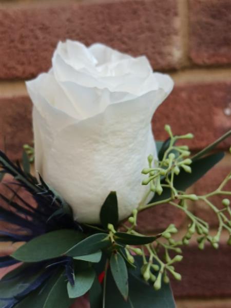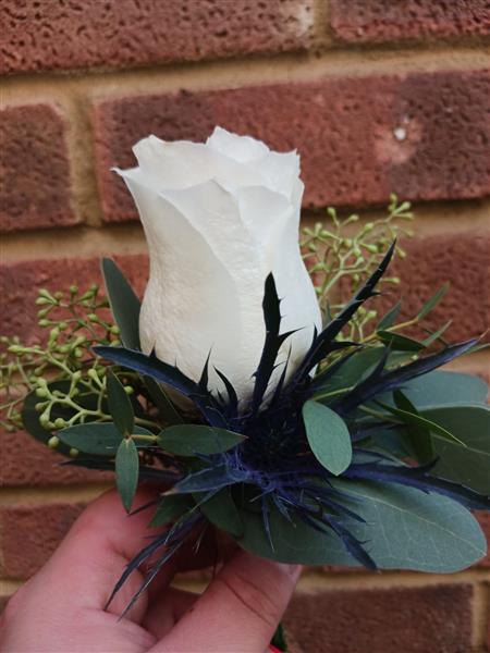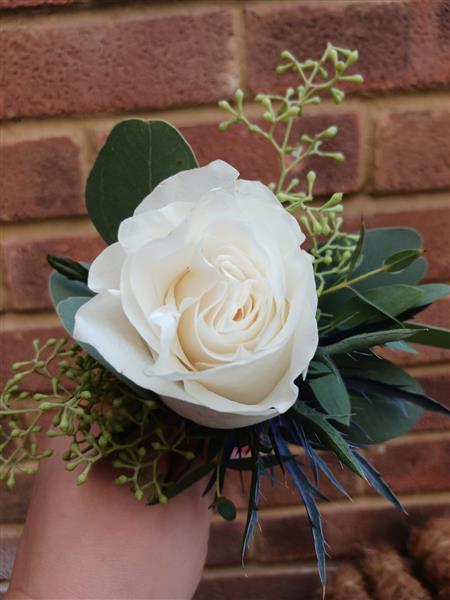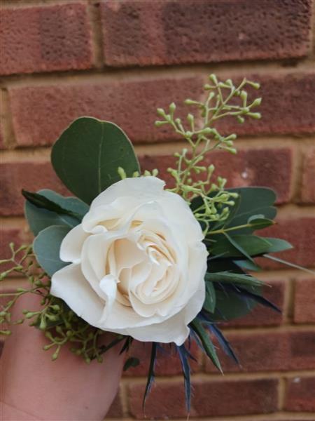 Finished with berries Eucalytpus and a touch of Eryngium thistle, this buttonhole looks smart and classy.