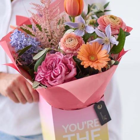 A lovely gift box of fresh flowers, chosen and arranged by the florist. This year our Mother’s Day designs are all about gorgeous pastels with pops of colour. Expect to see shades of baby pink, cream, and lemon with bursts of cerise and tangerine, and highlights of pale blue and lilac.