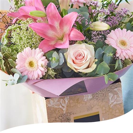 This bouquet features delicate flowers in soft pink tones, including Lilies, Mondial Roses and Gerberas, accompanied by green hues such as Ammi and Eucalyptus, as well as other flowers like Limonium and Astromelias. Each stem is carefully selected for its beauty. While your Lily Oasis bouquet may have slight variations in appearance from the one pictured, its enchanting allure remains equally stunning.