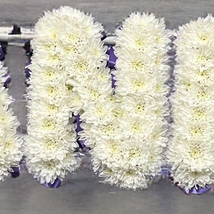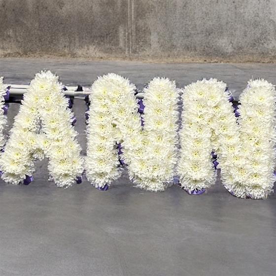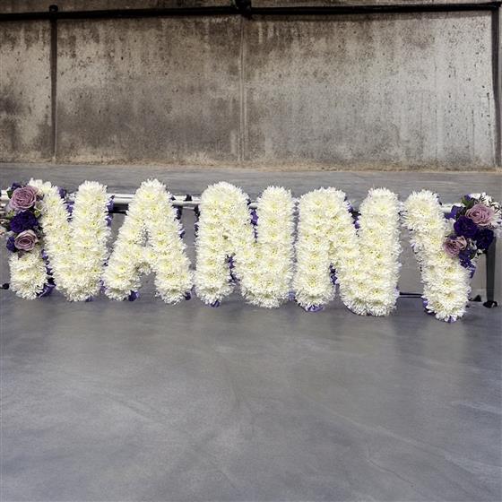 A Nanny flower tribute made with Chrysanthemum vase, Ribbon edging and matching flower sprays.