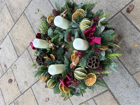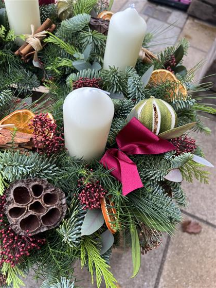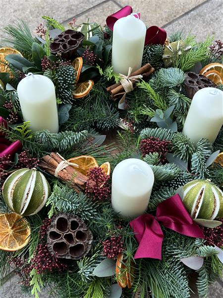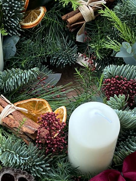 A natural advent wreath with tall pillar candles and a selection of Christmas decorations designed to last through December.