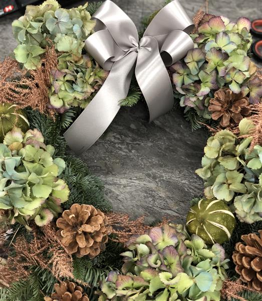 A 40cm Natural Dried Hydrnagea Blue Pine Wreath woth Copper Asparagus Fern, Pine Cones, Dried Limes and A lovely Silver Eleganza Bow