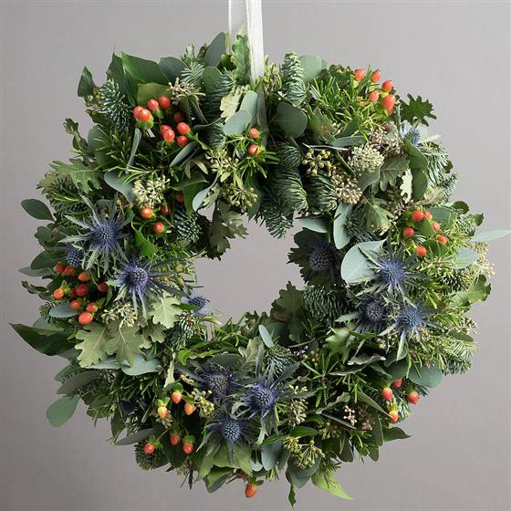 This handsome festive fresh door wreath is decorated with a mass of Christmas foliage, thistles and berries on a blue fir base creating an impressive welcome for your guests on arrival. This wreaths is hand-made with a fresh fir base so will last through the festive season and you have the ability to water the wreath to ensure longevity.