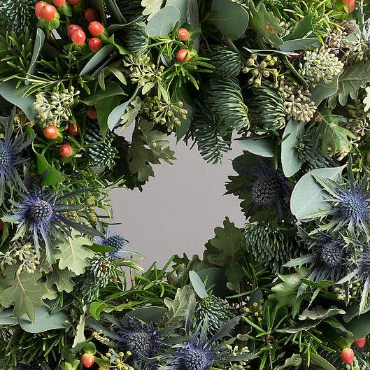 Hypericum, Eryngium, Mixed Winter Foliage on a Blue Fir Base