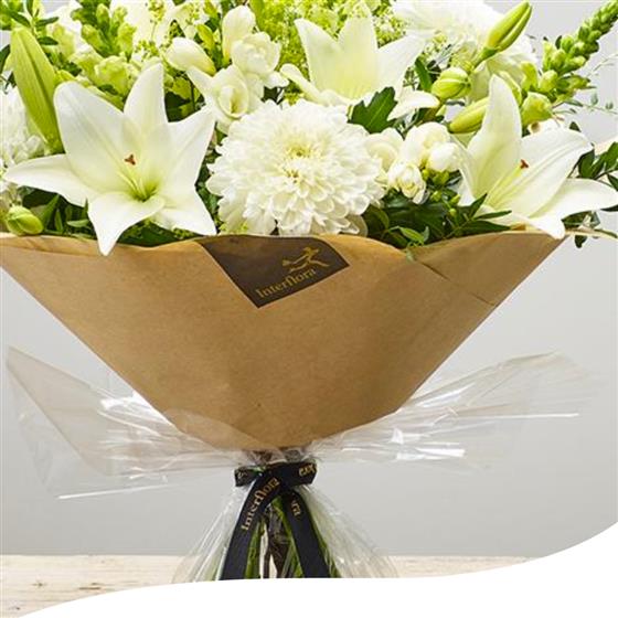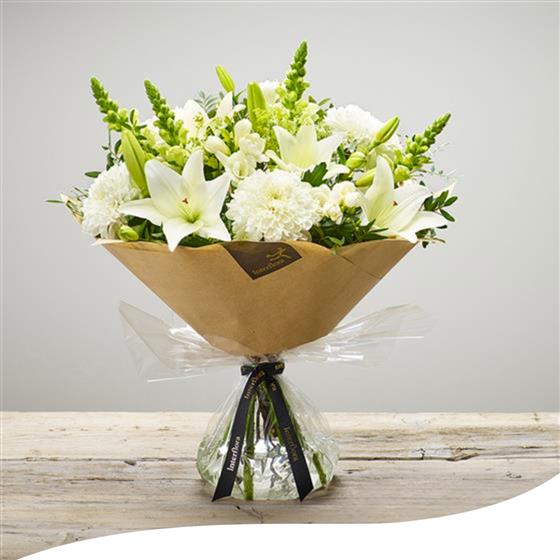 Experience the timeless elegance of our Opal Shimmer Bouquet (Large), a stunning all-white arrangement designed to captivate and inspire. This exquisite bouquet features a harmonious blend of pristine blooms, including elegant Lilies, delicate Antirrhinums, and other refined white flowers.
