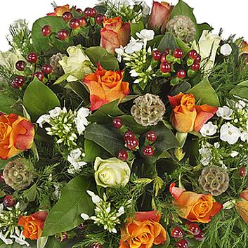 This bright Orange, Red and Green Posy includes Orange Roses, White Phlox, Red hypericum berries and Cream Avalanche Spray Roses.