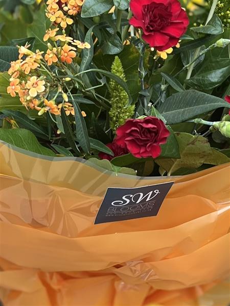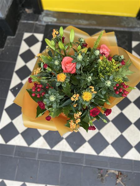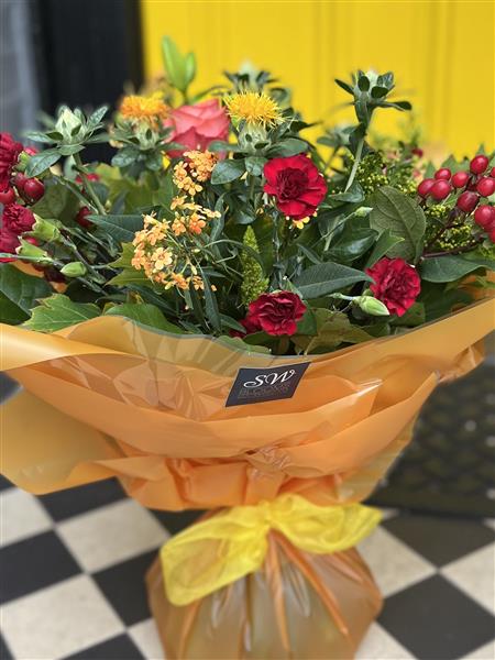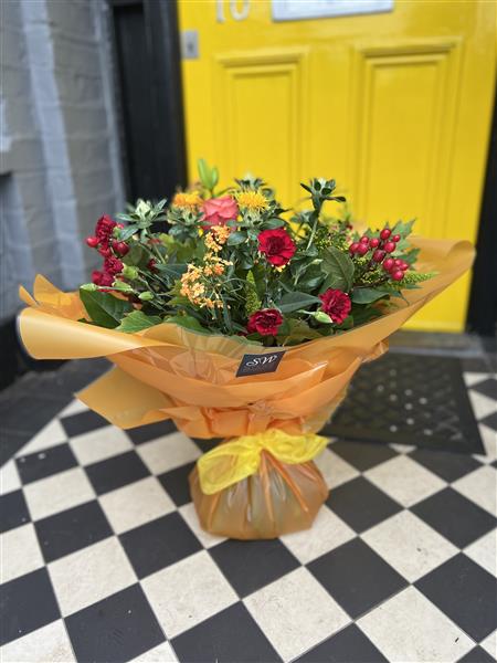 A seasonal Bouquet of fresh flowers using Reds, Oranges and Greens.