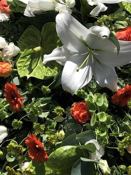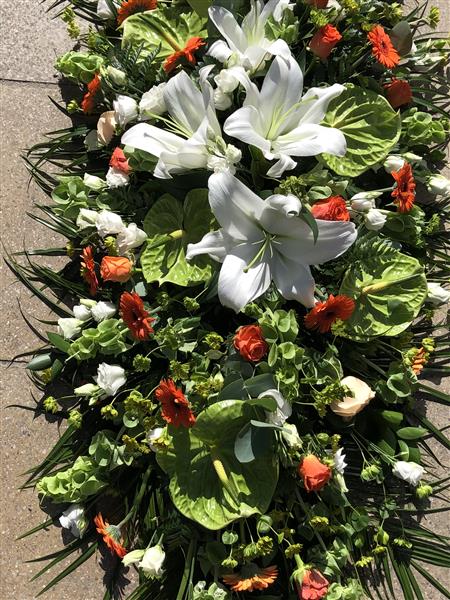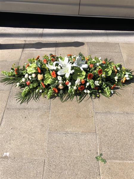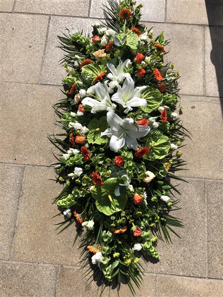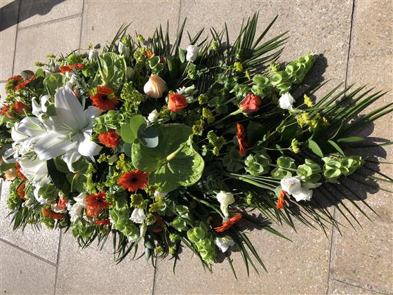 A beautiful large Coffin Spray in Green, White and Gold/Orange.
