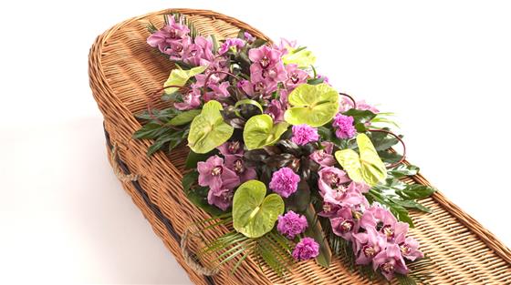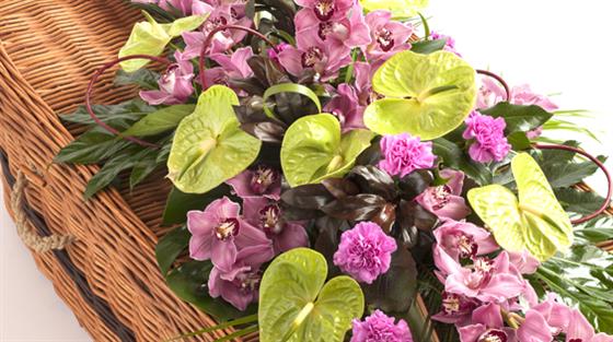This exquisite spray of dusky pink cymbidium orchids and lime green anthurium makes a very distinctive tribute. We’ve added purple carnations, phormim, typha, fatsia and aspidistra for extra colour and to give the spray its shape.