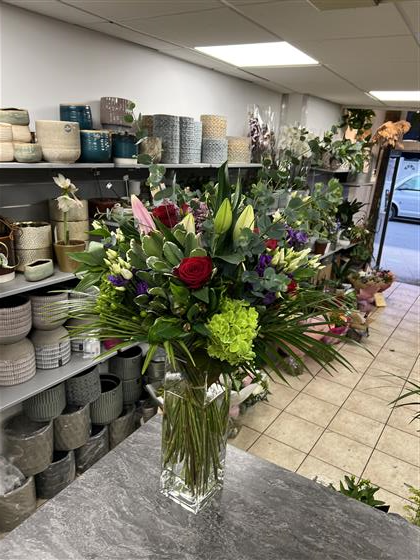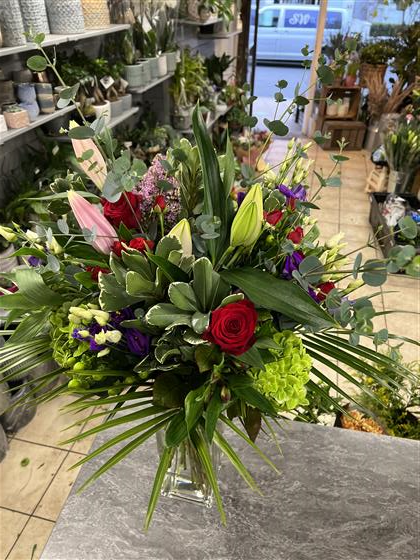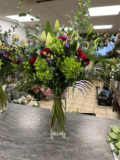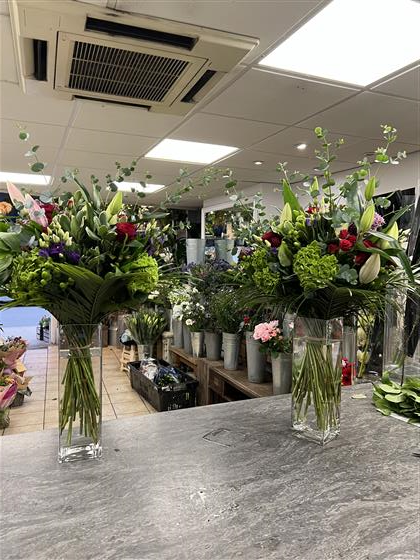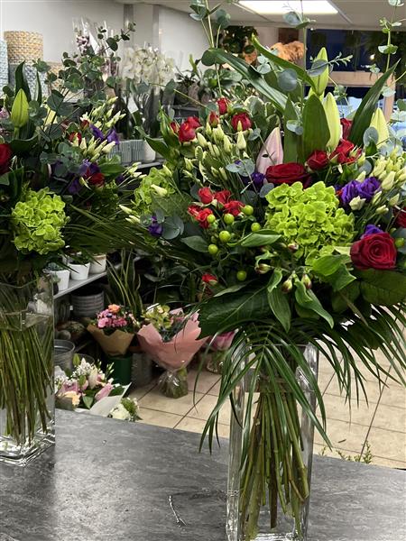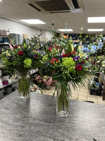 2 x large luxury vase arrangements using 8 Red Roses, 4 Green Hydrangeas, 2 Pink Lily’s, 4 Tall Eucalytpus, 5 Purple Lisianthus, 4 Green 5 Hypericum Berries, 5 Pink Alstro, 5 Red Spray Roses and 5 Pitto and Palm.
