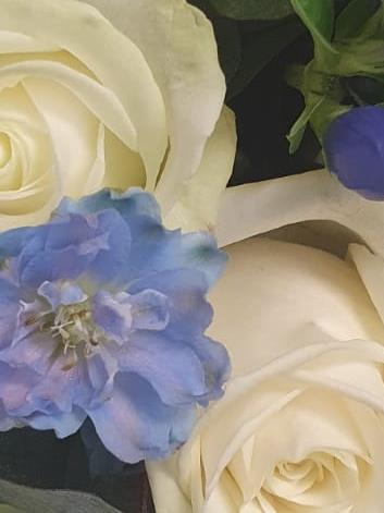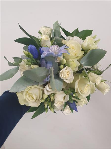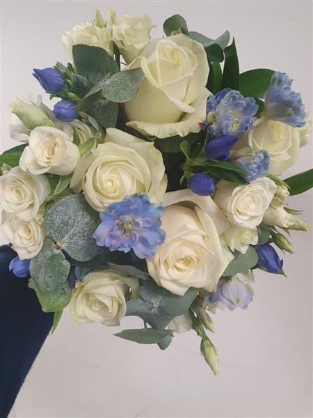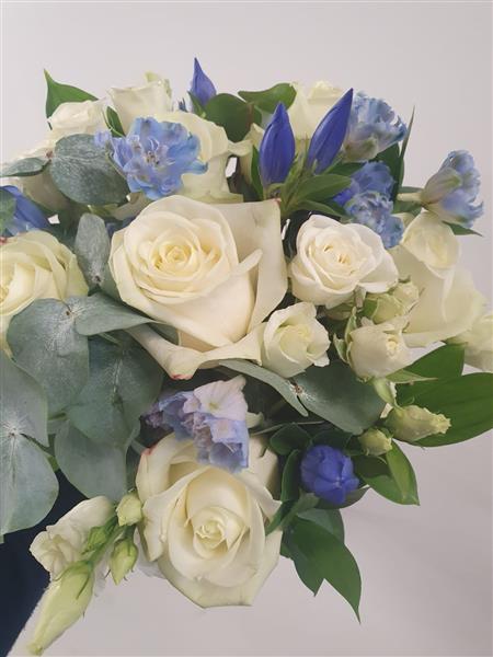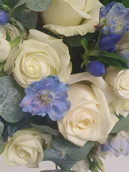 We will use pale blue Delphinium, White Avalanche Roses, Blue Gentian, White Spray Roses with some Cinerea Eucalyptus.