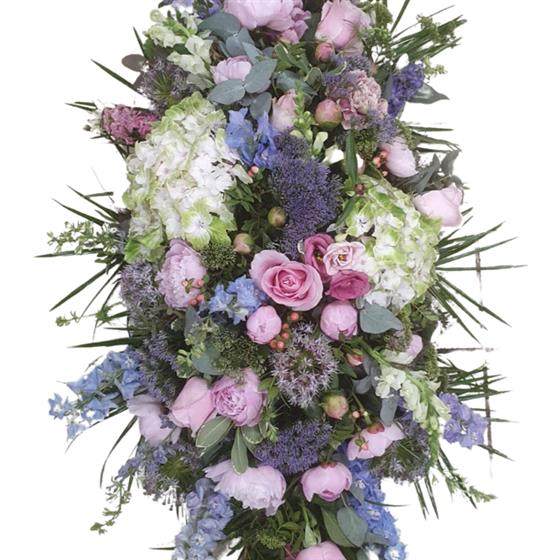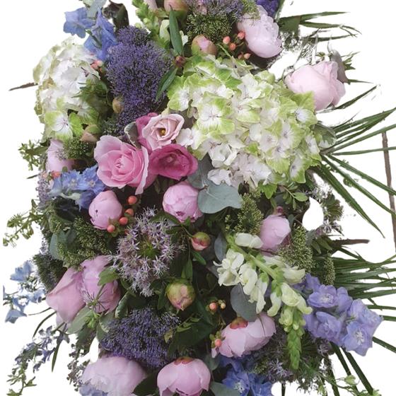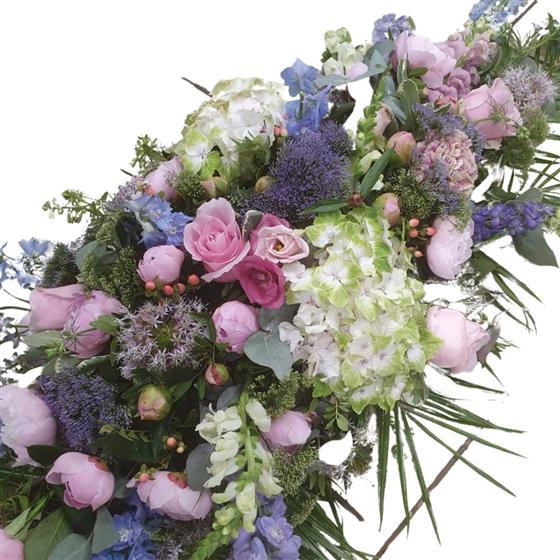Roses, Hydrangeas, Lisianthus, Delphiniums, Peonies, Tracheliums and Alliums.