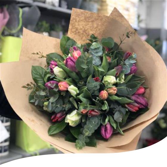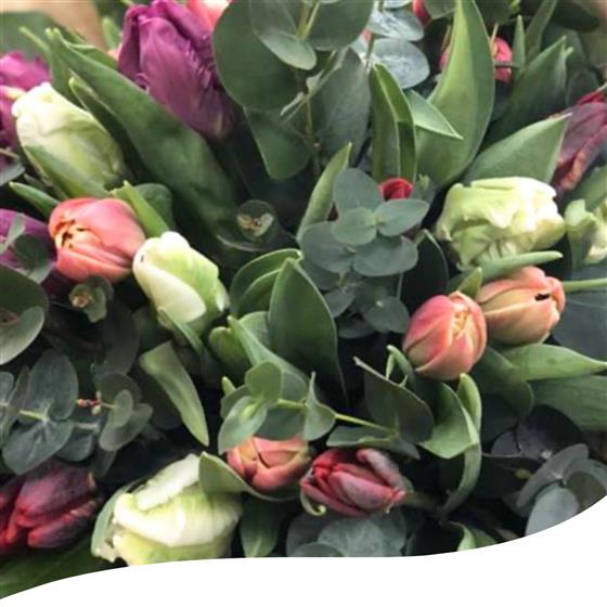Our mixed Parrot Tulip Hand-Tied & Eucalyptus an enchanting and vibrant arrangement that is perfect for any occasion. The hand-tied bouquet features a gorgeous blend of White and Green Parrot Tulips, Purple Prince Parrot Tulips, Red Rococo Parrot Tulips, and Colombus Tulips, creating a stunning display of colours and textures.