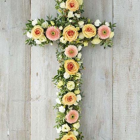 A cross of pretty pastels including peach roses and germini, white carnations and cream lisianthus.