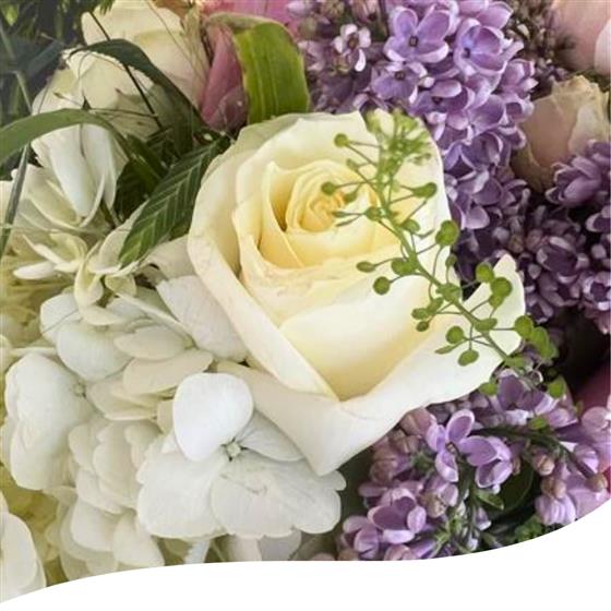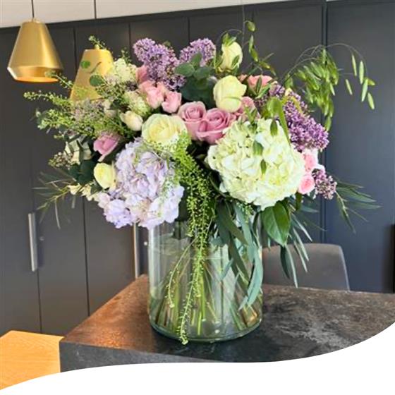 Introducing our Pastel Majesty Vase Arrangement, a breathtaking display of elegance and grace. This stunning arrangement features a luxurious selection of stunning flowers, including White and Lilac Hydrangeas, Roses, Eucalyptus, Lisianthus, Viburnum and Lilac Syringia, expertly arranged in a beautiful cylinder vase.