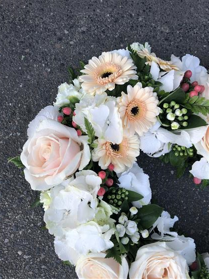 Using White Hydrangeas, Peach Gerberas, Vendela Roses, White Bouvardia, Green Carnations and Mixed foliage.