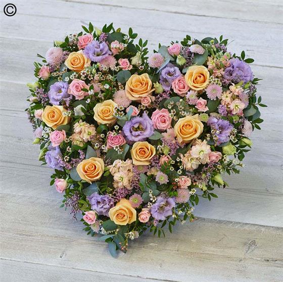 A heart tribute of pretty pastel shades featuring roses, limonium, chrysanthemum and fragrant stocks.