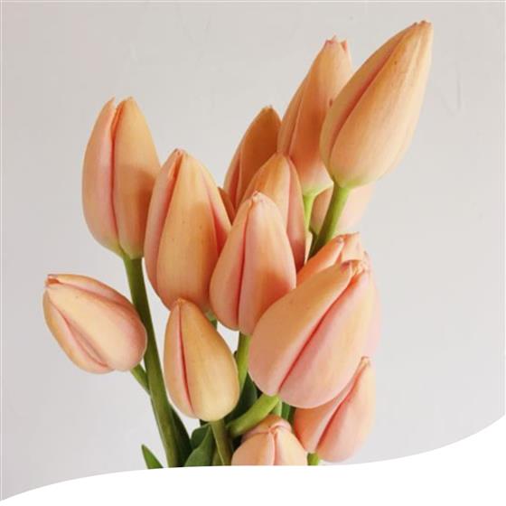 This hand-tied arrangement comes expertly crafted with 20 exquisite Tulips, all with a beautiful peach hue that will brighten any room. It comes carefully wrapped and presented in a gift box, adding a touch of elegance to your order. For those who want to make an even bigger statement, we offer larger sizes of this bouquet, with each size up adding 10 additional tulips to the arrangement.