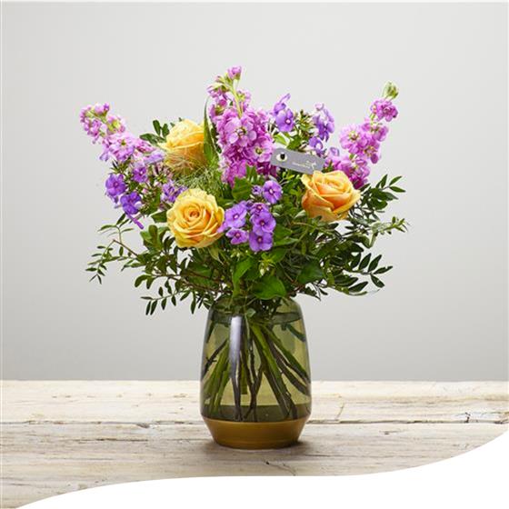 Indulge in the natural beauty of our Peach Twist Vase Arrangement, featuring a stunning arrangement of peach Roses, bright cerise Stocks, Phlox, and mixed foliage including Fountain Grass. Each bouquet is carefully arranged in a stylish glass vase, adding an elegant touch to any space.