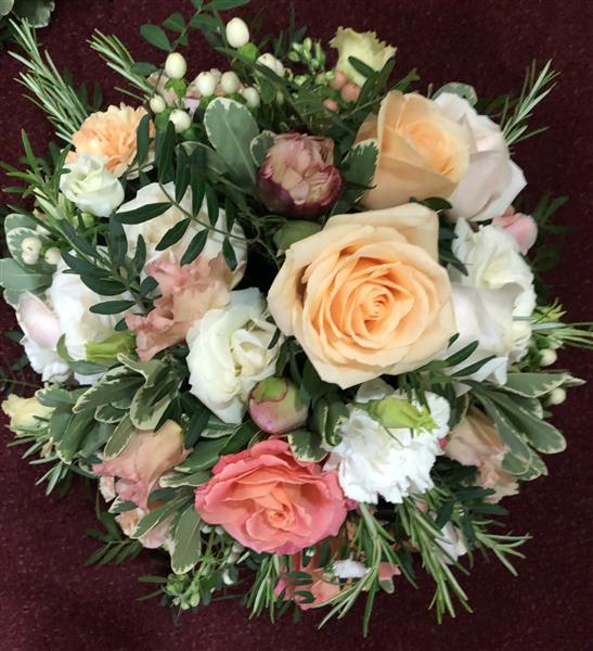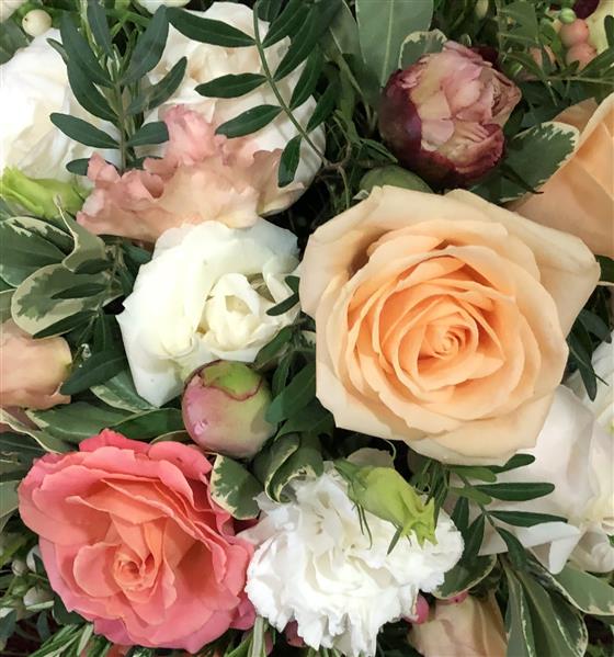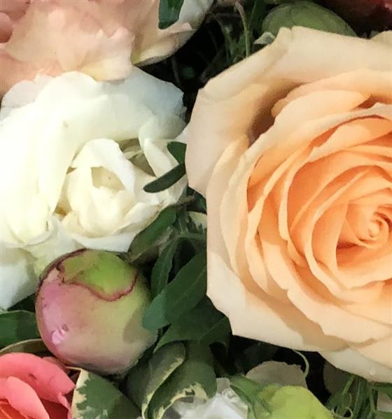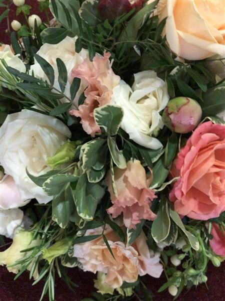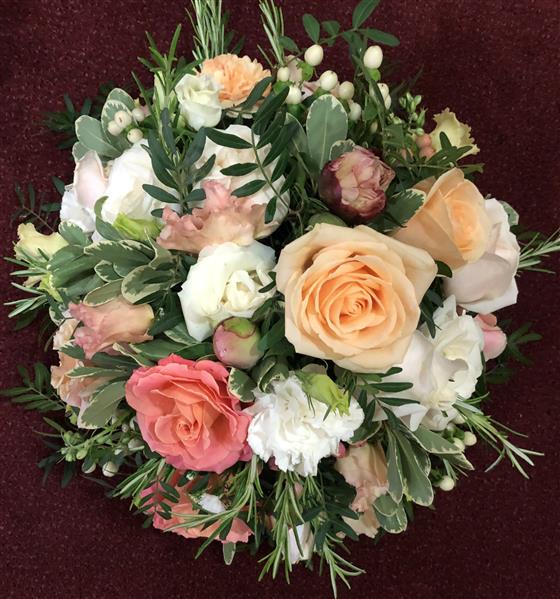 Peach Avalanche Roses, Miss Piggy Roses, Champagne Lisianthus, Cream Hypercium Berries, White Frilly Lisianthus and Pale Pink closed Peony’s.