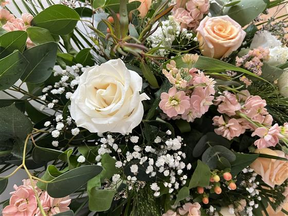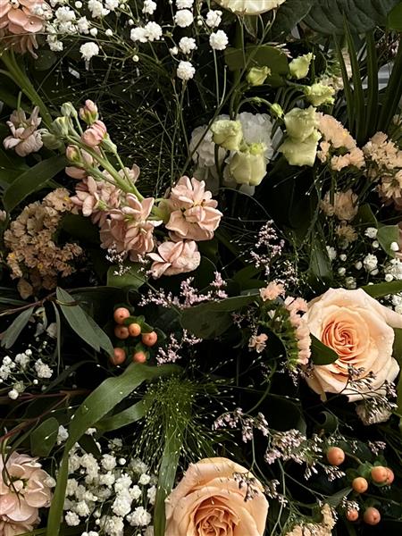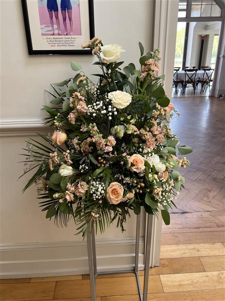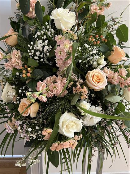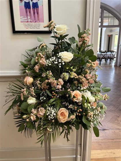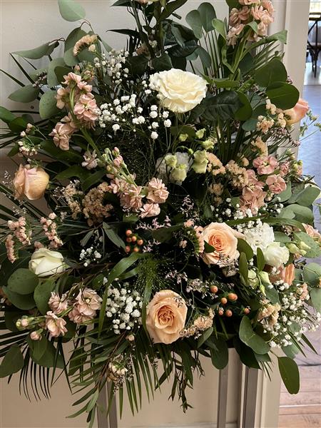 A beautiful front facing pedestal arrangement using wild flowers and grasses. Peach Stocks, Shinmer Roses, Peach Hypericum, Gypsophila, Peach Statice, White Lisianthus and a mix of foliage including Eucalyptus.
