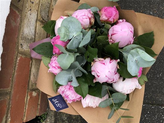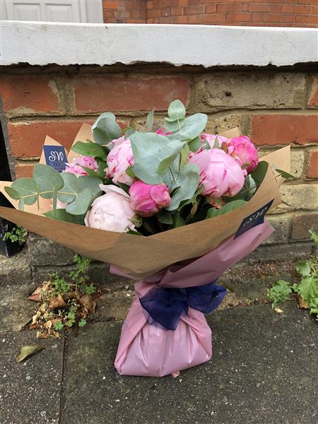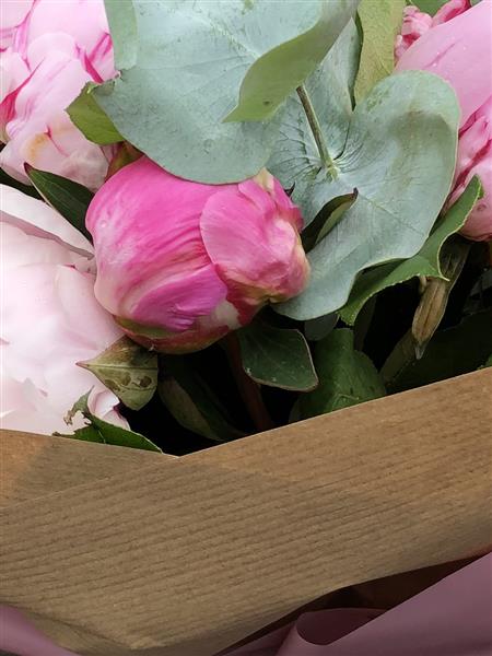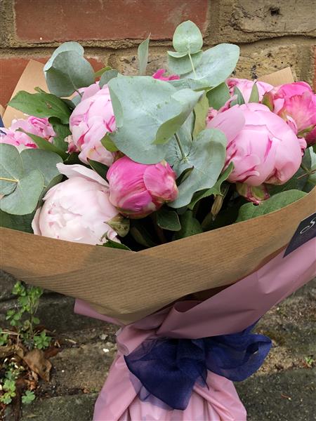 Mixed Peonies with Panicum fountain grass and eucalyptus Hand tied and gift wrapped in water.