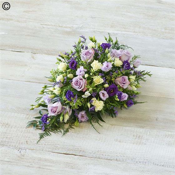 A delicate mix of blooms including roses, lisianthus and scented silvery rosemary. Arranged in a teardrop shape suitable for smaller coffins.